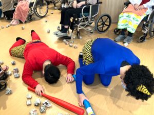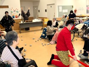 皆様の元気な掛け声とともに宙を舞うのは、豆に見立てて丸めた新聞紙です。これなら思いっきり投げても痛くありません(笑)。 日頃の鬱憤が込められた一撃を受け、鬼たちは慌てて転げ回りながら逃げ惑います💦