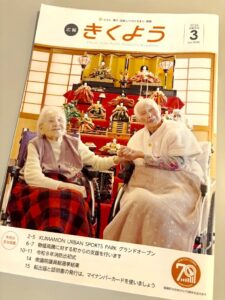 なんと、菊陽町の広報誌「広報きくよう(3月号)」の表紙に、ケアタウン光の森のお雛様をバックにした入居者様2名のお写真が掲載されることになったのです!お二人の穏やかで素敵な笑顔が、地域の皆様にお届けできることを職員一同も大変嬉しく思っております。お手元に届いた際は、ぜひご覧ください。