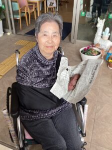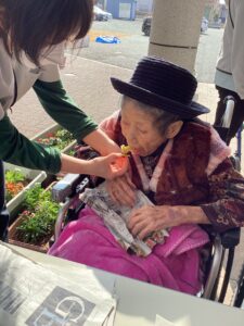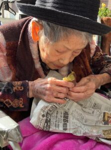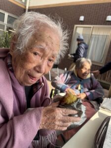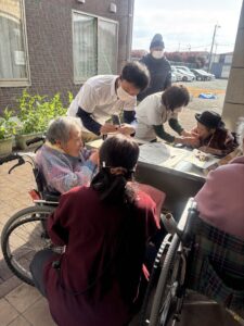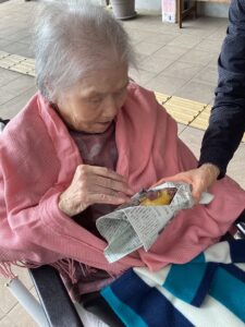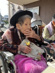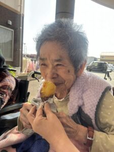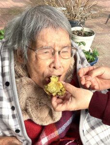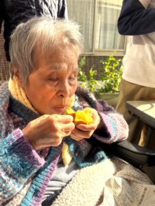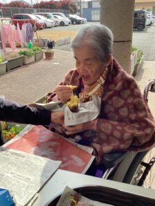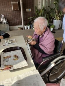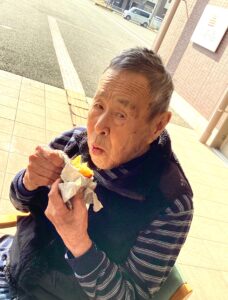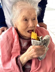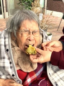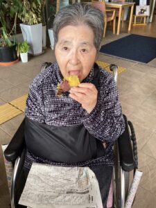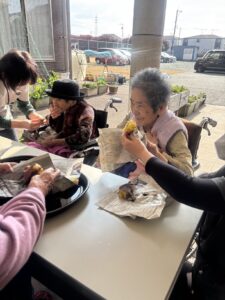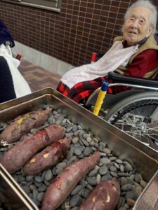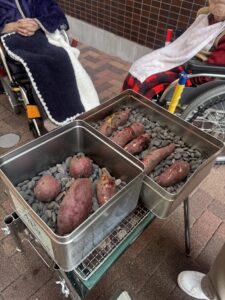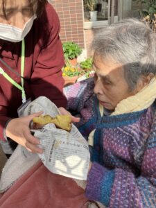 入居者の皆様には、しっかりと厚着をして中庭へ出てきていただきました。出来立てホカホカ、アツアツの焼き芋🍠を手に、 「あついあつい!」 と言いながらも、皆様のお顔はニコニコ笑顔。「おいしいね~」「甘いね~」という声が飛び交い、皆様大きな焼き芋をペロリとたいらげていらっしゃいました。 外の冷たい空気の中で食べる熱々の焼き芋は、また格別の美味しさだったようです。